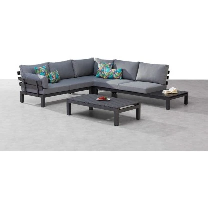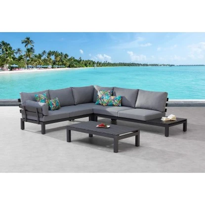 Die 4-teilige Lounge-Gruppe Manarola besteht aus 1 2-Sitzer mit Kopfverstellung, 1 geschlossenen 2-Sitzer, 1 Eckelement und 1 Tisch sowie passenden Polsterauflagen. Die Aluminiumgestelle und die Ablageflächen in leichter Lattenkonstruktion sind absolut wetterbeständig und rostfrei. Das Ablagedeck bietet Stellfläche für Utensilien und kann mit einem Handgriff hochgeklappt werden. Somit kann der 2-Sitzer zu einer komfortablen Liege umfunktioniert werden. Der Couchtisch ist höhenverstellbar von 34 cm auf 58 cm – ideal für das Dinner, das in der Lounge eingenommen wird. Die bequemen Sitz- und Rückenpolster sind mit angenehm weichem Sensotex (100 % Acryl) bezogen. Der Stoff ist wasser- und schmutzabweisend. Die Bezüge sind mit einem Reißverschluss ausgestattet und können abgezogen und gewaschen werden.