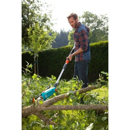 Der Gardena Elektro-Teleskop-Hochentaster TCS 720/20 ermöglicht Ihnen das einfache Kürzen von hohen Ästen, ganz ohne die Verwendung einer Leiter. Durch den langen Teleskoparm ist ein Kürzen und Auslichten von Baumkronen in einer Höhe von bis zu 4,4 m problemlos möglich. Zusätzlich hat er den Vorteil, dass auch heruntergefallene Äste bequem zerkleinert werden können. Das Arbeiten im Baum stellt aufgrund des schmalen Designs und des dementsprechend niedrigen Gewichts ebenfalls kein Problem dar.