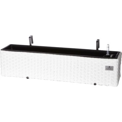 Der Polyrattan Balkonkasten Polyrattan setzt dekorative Akzente auf Ihrem Balkon. Der Balkonkasten ist aus einem hochwertigen PE-Kunststoffgeflecht hergestellt, das über einen Metallrahmen gewebt ist. Die Faser ist UV- und temperaturbeständig, langlebig und pflegeleicht. Durch den integrierten Wasserspeicher brauchen Sie seltener zu gießen, das Bewässerungssytem bietet eine optimale Versorgung und Gießkontrolle durch einen Wasserstandsanzeiger. Der Balkonkasten ist mit Überläufen im Boden ausgestattet, um einen Wasserstau zu vermeiden, die bei Aufstellung im Haus (z.B. im Wintergarten) einfach mit beigefügten Kunststoffschrauben verschlossen werden können. Die Balkonkasten-Halterung ist einfach und schnell zu montieren. Die Aufnahmeöffnung der Haken ist für bis zu 5,8 cm breite Balkonbrüstungen bzw. Geländer geeignet, darüber hinaus können auch passende handelsübliche Aufhängungen (separat im Handel erhältlich) verwendet werden. An der Rückseite befindet sich ein Abstandshalter, damit der Balkonkasten immer gerade hängt. Der Kunststoffeinsatz zur Bepflanzung kann bequem außerhalb des Gefäßes bepflanzt und dann eingesetzt werden.