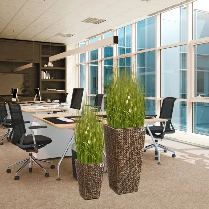 Das Gartenfreude Pflanzkübel Set mit Wasserhyazinthengeflecht kommt mit einem Top in 38 cm x 38 cm x 77 cm und 28 cm x 28 cm x 43 cm.