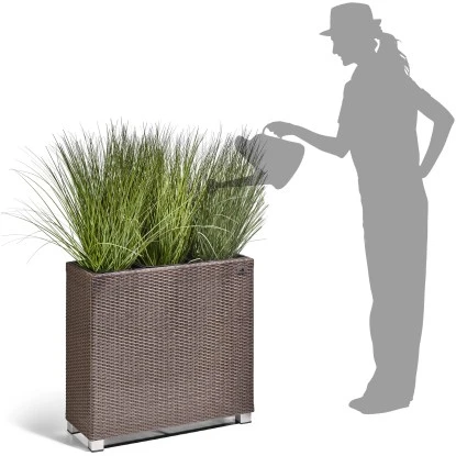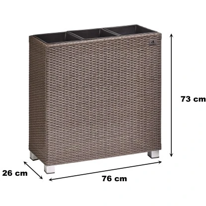 Der Pflanzkübel Polyrattan ist ein Pflanzgefäß für den Innen- und Außenbereich und setzt dekorative Akzente im Haus, auf der Terrasse oder im Garten. Das Pflanzgefäß ist aus einem hochwertigen PE-Kunststoffgeflecht hergestellt, das über einen rostbeständigen Alu-Rahmen gewebt ist. Die Faser ist UV- und temperaturbeständig, langlebig und pflegeleicht. Der Kunststoffeinsatz kann bequem außerhalb des Gefäßes bepflanzt und dann eingesetzt werden und bietet mit einer Größe von 24 cm x 24 cm 24,5 cm ausreichend Platz. Gegenüber Einsätzen aus anderen Materialien bietet dieser den Vorteil, nicht zu rosten und absolut wasserdicht zu sein. Bei Außenaufstellung einfach ein Loch in den Boden bohren, um Staunässe zu vermeiden. Das Pflanzgefäß ist mit dekorativen Aluminium-Füßen versehen.