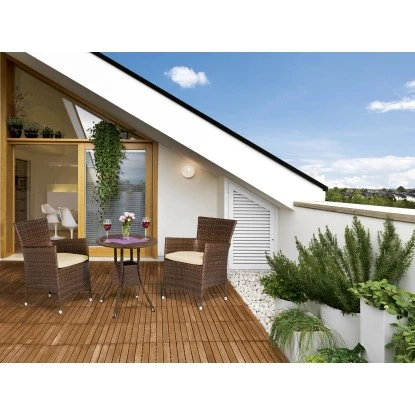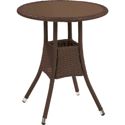 Sein braunes Polyrattan-Geflecht versprüht Gemütlichkeit und ist zudem wetterfest. Die Tischplatte besteht aus Sicherheitsglas. Die Gestellkonstruktion verfügt über vier Tischbeine, die mit sichtbaren Verstrebungen aus Polyrattan-Geflecht ausgeführt sind. Der Tisch ist 70 cm hoch und hat einen Ø von 60 cm.