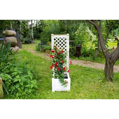 Der kleine Pflanzkasten mit Rankgitter setzt mit farbenfrohen Kletterpflanzen bepflanzt Ihre Terrasse stilvoll in Szene und schafft einen schönen Sicht- und Windschutz.