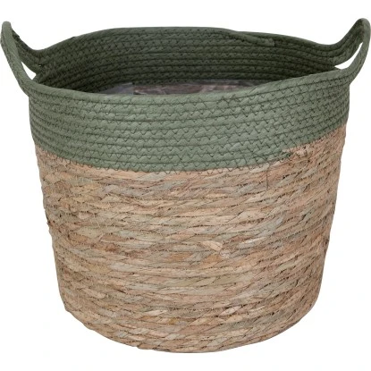Der runde Korb eignet sich als Übertopf zur Dekoration von Pflanzen oder Kräutern in Innenbereichen. Es besticht durch seine natürliche Optik und das dekorative Korbdesign. Der Dekokorb stellt die Maße 22 cm x 27 cm (H x Ø) zur Verfügung. Gefertigt ist er aus Naturgras und Stroh in der Farbkombination Natur-Grün. Innen ist der Topf mit einer wasserdichten Folie ausgeschlagen, sodass Gießwasser als Vorrat zurückgehalten wird. Dadurch werden Möbel und das Material selbst geschützt.